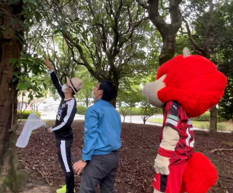 8月26日(木)、片山アンバサダーとロアッソくんが熊本県民総合運動公園にて、「熊本市市民参加型セミ調査」を行ってきました。
