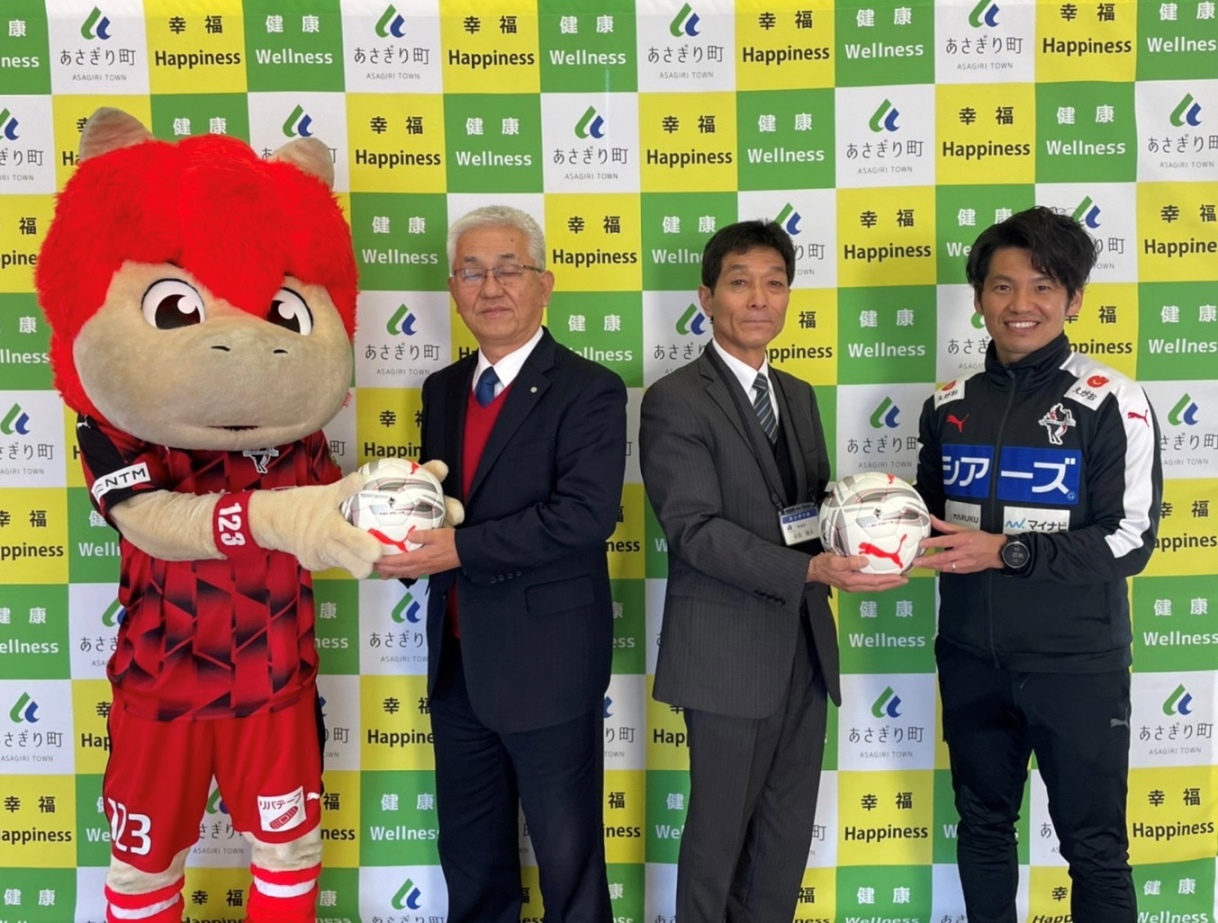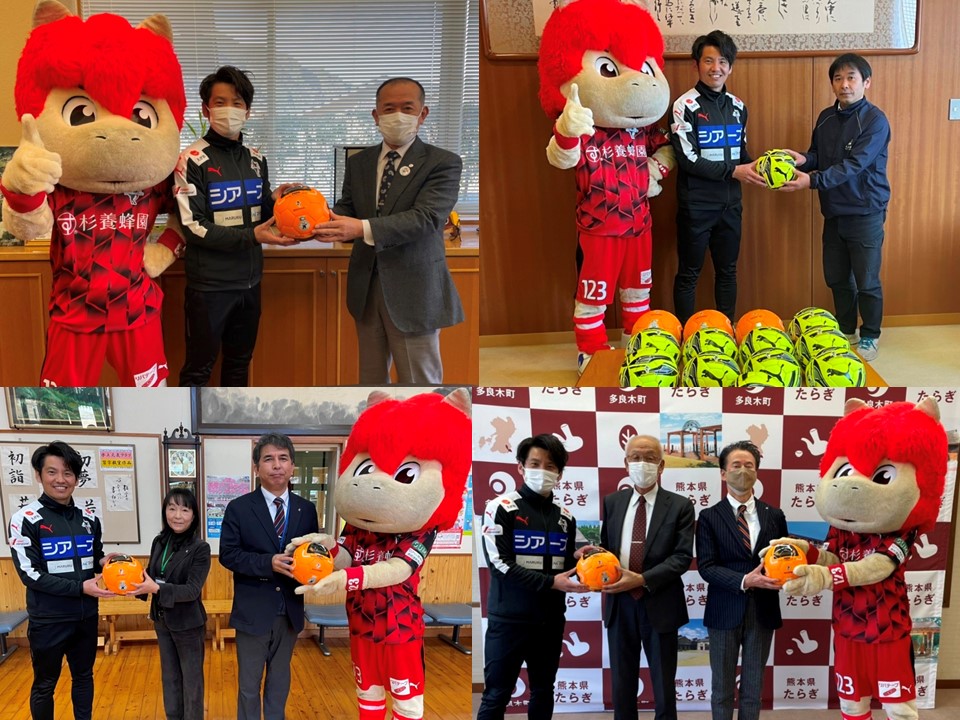 1月21日(金)、クラブサプライヤーの熊本トヨタ自動車㈱様とロアッソ熊本が共同で行う地域貢献事業「1ゴールアシスト5」プログラムにより、五木村、水上村、多良木町、あさぎり町、錦町へ片山クラブアンバサダーとロアッソくんがサッカーボールの贈呈を行いました。