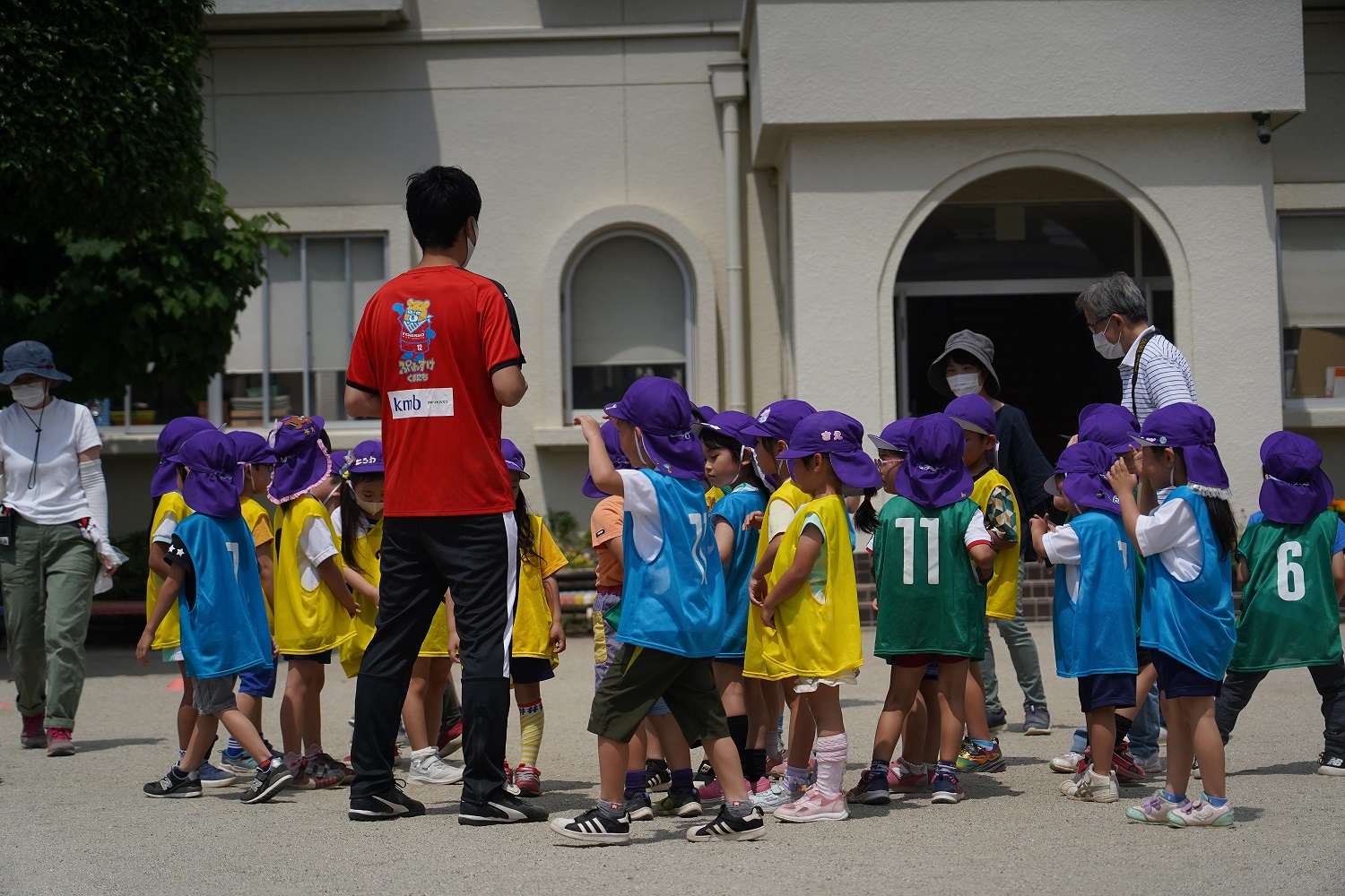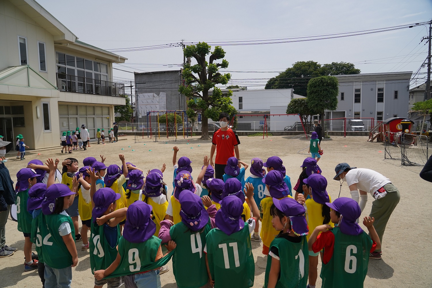晴天に恵まれた中での開催となり、園児は楽しく鬼ごっこなどのウォーミングアップからサッカーのトレーニングと試合まで楽しく行うことができました。