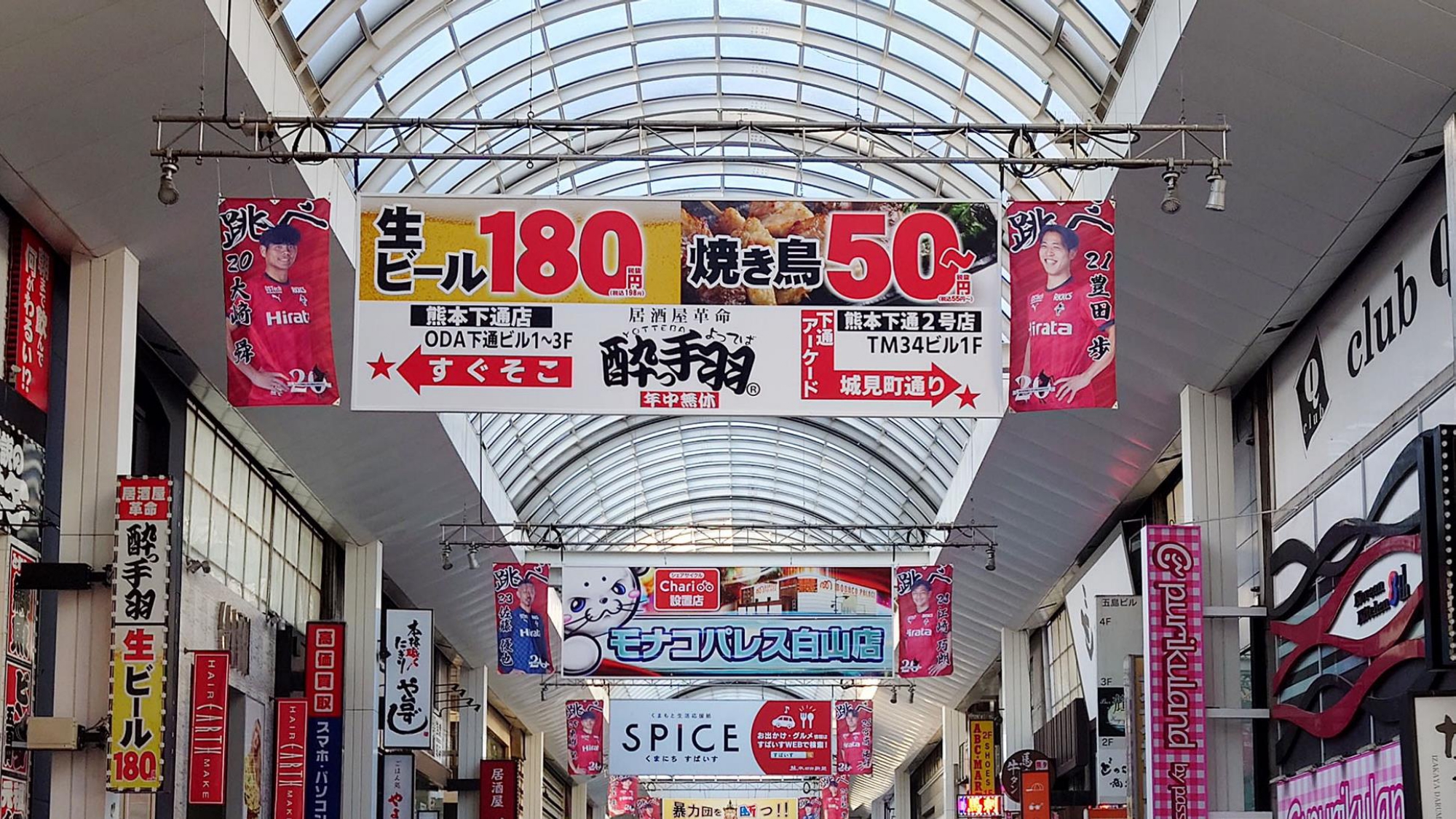 「熊本市新市街商店街振興組合」様、「下通繁栄会」様、「銀座通り繁栄会」様、「駕町通り商店街振興組合」様のご協力により毎年掲出して頂いております「ロアッソ熊本応援タペストリー」が、2024シーズンバージョンとなり、今年も新市街アーケード、下通アーケード、駕町通り、銀座通りに掲出されました。