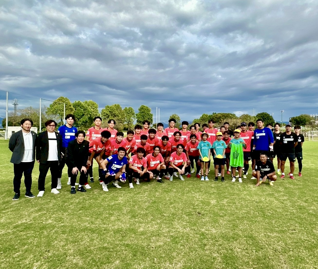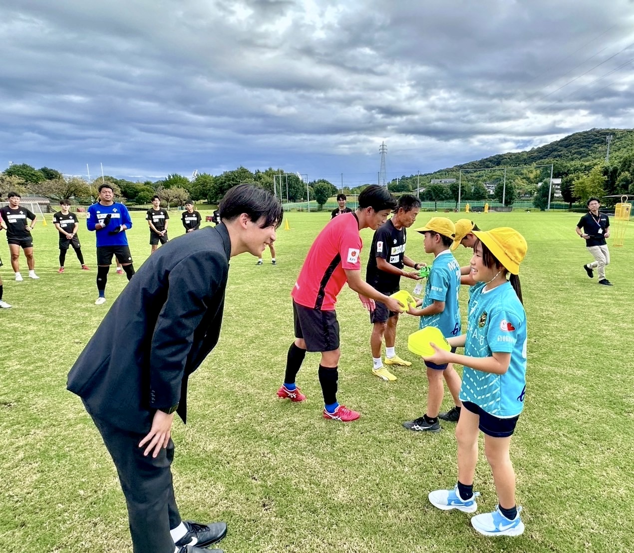 当日は、練習場に来ていただいた玉東FCの子どもたちへ、アドミラル様、大木監督、岩下選手より贈呈をいただき、最後にみんなで集合写真を撮影しました。
