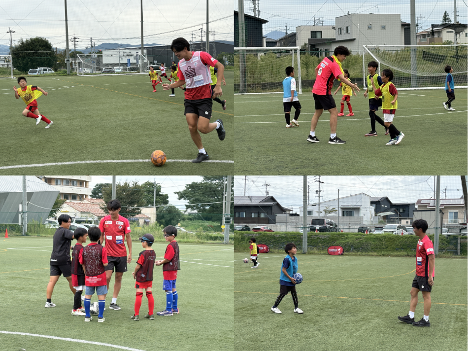 ミニゲームでは、選手が優しく声をかけながらプレーし、子ども達のゴールにはハイタッチで応えるなど、終始和やかな雰囲気でサッカー教室を実施することができました。