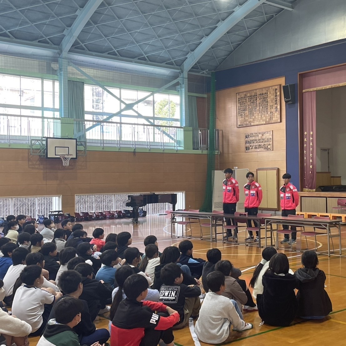 合志南小学校を訪問し、子ども達と一緒に給食を食べて、昼休みにサッカーを楽しんだあと、職業講和を行いました。