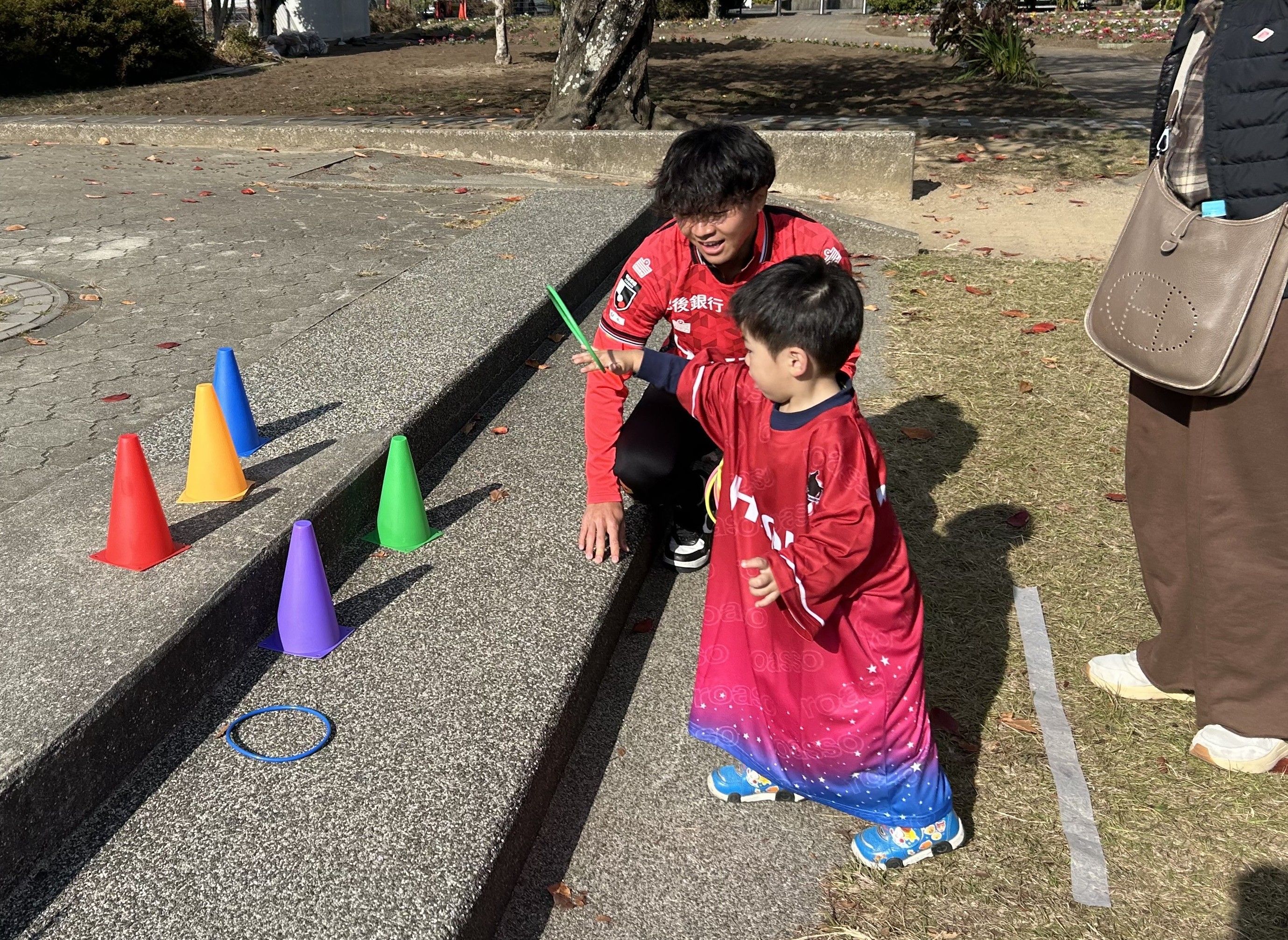 塩浜選手は輪投げコーナーで投げ方を伝授。思い通り投げられない子どもを優しくフォローしていました。