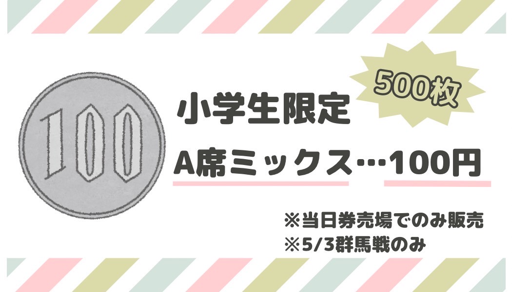 5/3(水・祝)群馬戦では、小学生はA席ミックスのチケットがなんと100円!当日券売場限定で先着500枚販売いたします。
