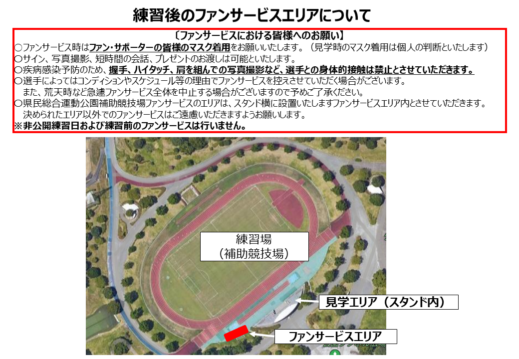 5/10(水)ロアッソ熊本トップチームは、県民総合運動公園補助競技場でのトレーニングを予定しております。 練習見学は可能ですが、スタンド内のみとさせていただきます。 なお、練習後のファンサービスエリアにつきましては、スタンド横にファンサービスエリアを設置いたしますので、エリア内でのファンサービスのご協力をよろしくお願いいたします。