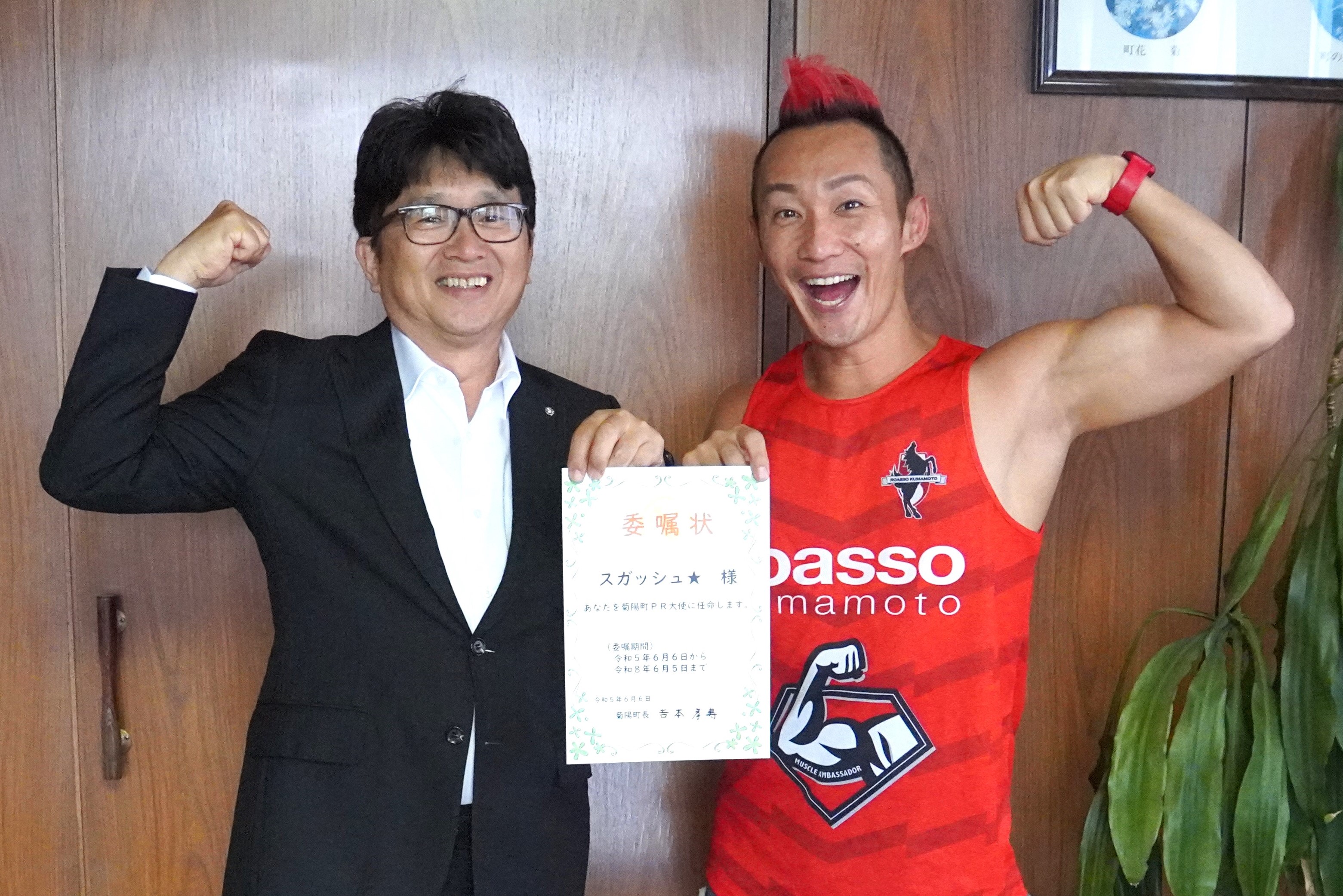 この度、2023”火の国もりあげタイ!” 実施自治体の菊陽町を幅広くPRし、地域を活性化するため、ロアッソ熊本マッスルアンバサダーのスガッシュ★が「菊陽町PR大使」に任命されました。 既に任命されている黒木晃平選手、伊東俊選手、佐藤優也選手と共に菊陽町の魅力を県内外に発信していきます。 大使の活動 (1)菊陽町の魅力発信や知名度向上につながる活動 (2)その他菊陽町の地域の活性化等を図るために、町長が必要と認める活動