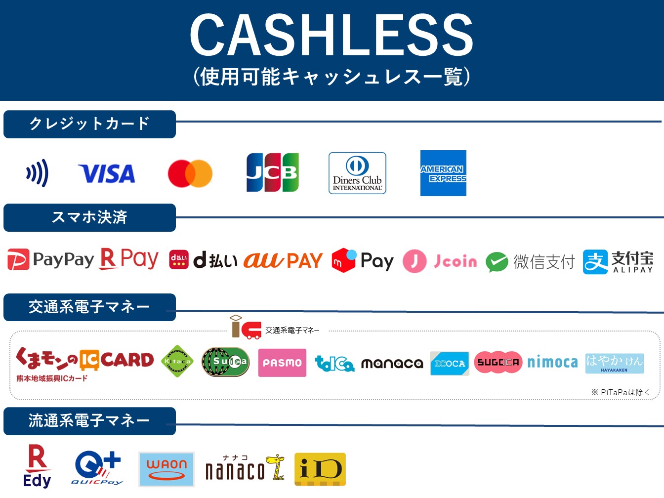 ・交通系IC:くまモンのIC CARD 、SUGOCA、Suica、PASMO、ICOCA