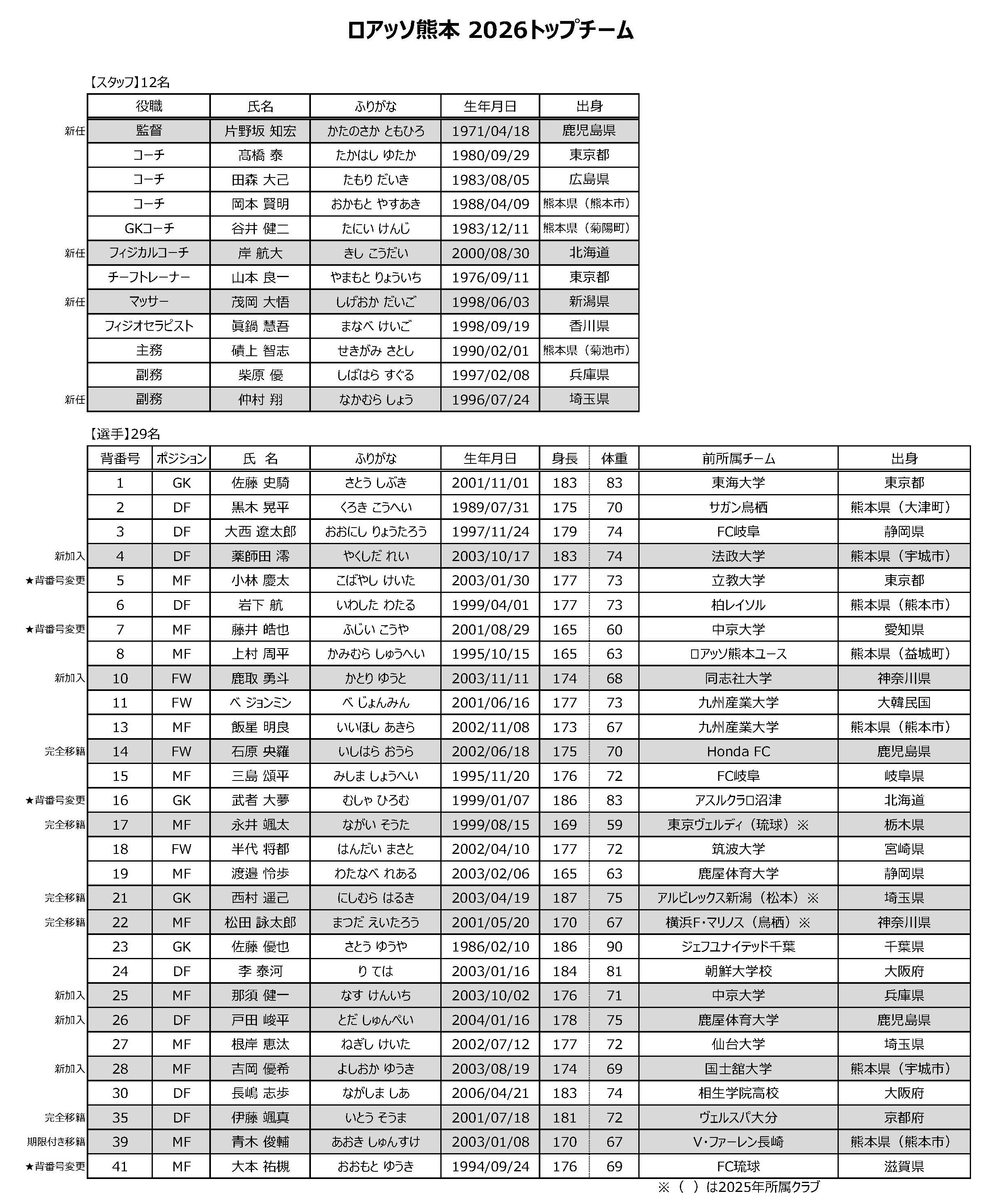 このたび、2026シーズンのロアッソ熊本トップチームの新体制および選手の背番号が決定いたしましたのでお知らせいたします。