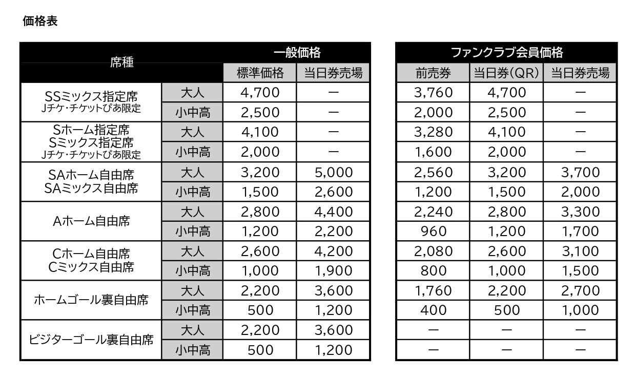 ※SSミックス指定席、Sホーム指定席、Sミックス指定席につきましては、Jリーグチケットもしくはチケットぴあ(セブン-イレブンマルチコピー機)限定販売となります。当日券売場では販売いたしませんので、予めご了承ください。